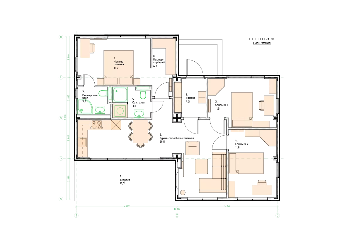 Модель "ULTRA 88" представляет одноэтажный дом современного дизайна общей площадью 88 квадратных метров. Этот компактный и экономичный вариант отлично подходит для маленькой семьи или пары, ищущей уютное и функциональное жилище.